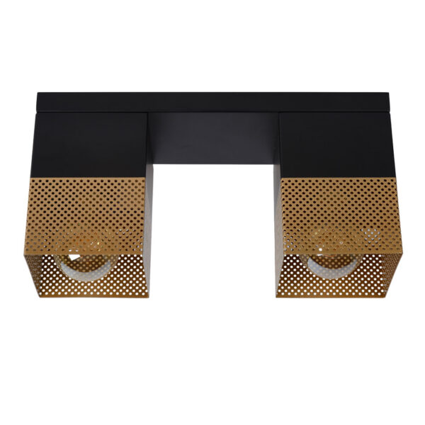 Like a magnet, this ceiling lamp immediately draws the eye. Renate is the name. The modern light fixture brings two light bulbs together in one sleek design. The combination of solid black volumes and perforated brass around the light bulbs gives Renate its unique appearance. From the metal design, two bulbs cast their warm light neatly downwards. That means you have functional light at any time. How bright that light shines is up to you. Renate can easily be connected to a dimmer.