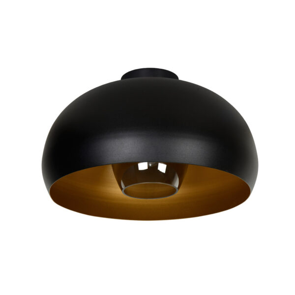Fancy a touch of nostalgia? Then Sharan is definitely for you. You cannot call this ceiling lamp small, with its diameter of 38 centimetres and a little more than 22 centimetres tall. Sharan’s hemisphere is smooth on the outside and has a metallic inside. The lamp itself is encased in an inverted fume glass. Sharan is your eye-catcher above the wall cabinet, counter or bar furniture. Due to its open-work form, the filament bulb comes into its own. Create the right atmosphere by connecting it to an external dimmer.