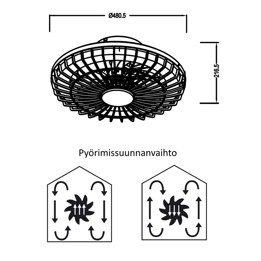 MILANO LED is a stylish and versatile ceiling fan light that combines efficient cooling and adjustable LED lighting into one modern whole. It is ideal for a living room, bedroom or office space where comfort, practicality and design are valued. You can choose from six different fan speeds or schedule the fan to operate for 1, 2, 4 or 8 hours. The lighting part consists of an efficient 25 W LED ring light and a 5 W LED central light, which provide versatile and even lighting. The color temperature is infinitely adjustable between 3000 and 5500 K, allowing you to choose between warm ambient light or bright task light as needed. The light output can also be flexibly adjusted, and the memory function saves the last used settings for the next time you use it. The MILANO LED fan light also features a reversible fan that allows you to adjust the air flow according to the season, as well as a night light function for peaceful lighting. All functions are conveniently controlled with the included remote control. MILANO LED offers the perfect combination of lighting and cooling – easily adjustable to your needs. The diameter of the light is 480 mm and the height is 220 mm. Fixed installation on the ceiling surface.