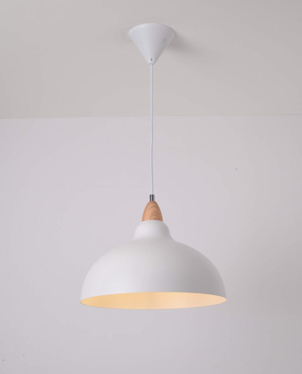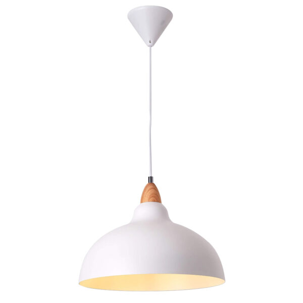 The Alma pendant lamp is a stylish and timeless lamp that combines high-quality materials and a minimalist design. The lamp has a diameter of 35.5 cm and has a metal shade that exudes a modern aesthetic. The wooden detail brings warmth and naturalness to the whole. The lamp is designed to be used with a 1xE27-base, maximum 12 W LED bulb (not included in the package). The white color makes this lamp versatile and easy to combine with different interior styles. Perfect for above the dining table, in the living room or bedroom to create pleasant lighting.