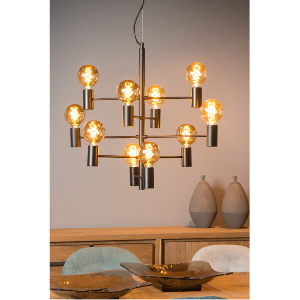 With ten light points, this pendant lights exudes the grandeur and lustre of days long gone. The sleek lines make Leanne, as this pendant light is called, look modern while still maintaining a simple style. And it is that simplicity that makes Leanne fit in anywhere. The metal, combined with smoky filament bulbs, creates a sense of cosiness. The pendant light can simply be installed on the ceiling with a fixing plate. The fixture can then simply be connected to a dimmer and is height-adjustable, depending on the room.