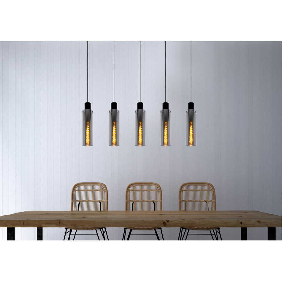 Five lightsources means five times the mood and style. This version of the Orlando pendant light is the perfect companion for a modern dining room. The black smoked glass gives the room a mysterious and cosy glow. Especially when combined with a tubular filament bulb, also in smoked glass. You can let Orlando shine optimally by hanging it at the right height in the room. You can adjust it yourself, from 120 to 172 centimeters. Connect it to a dimmer and create the right mood for every dinner occasion.
