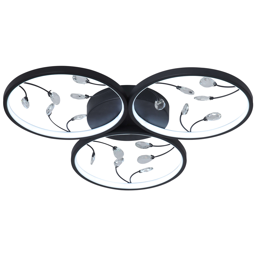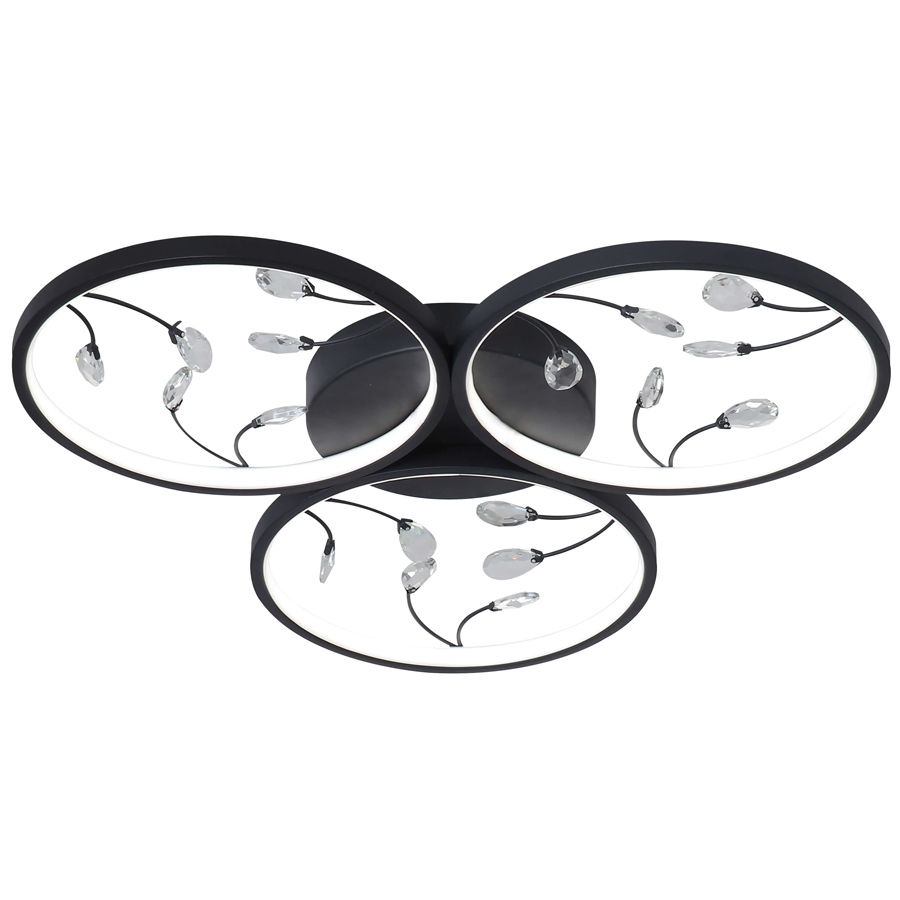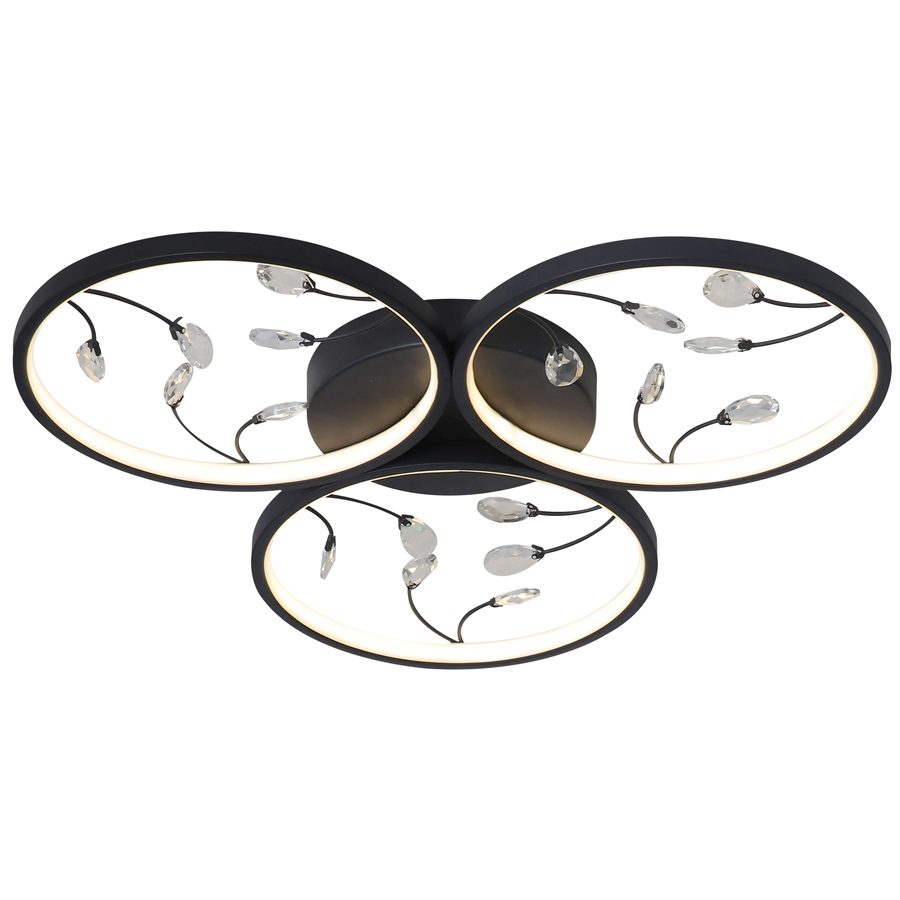The Rings LED ceiling lamp, with a diameter of 62 cm, is equipped with three 10 W LED rings, which produce a total of an impressive 3600 lm of light output. The light source is an integrated 30 W LED with a light output of max. 3600 lumens and a light color of 3000 – 6000 Kelvin. The color temperature and light output are infinitely adjustable with the included remote control. The lamp also has a night light function. The diameter of the lamp is 62 cm and the height is 8 cm. The lamp is installed directly in the ceiling box and the connection is made with a sugar cube. The black color gives the lamp an elegant and timeless appearance, while the decorative crystals add a touch of luxury and sparkle.