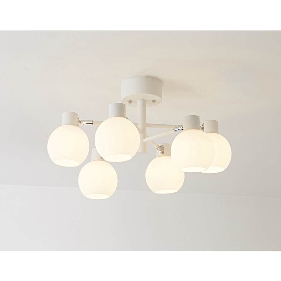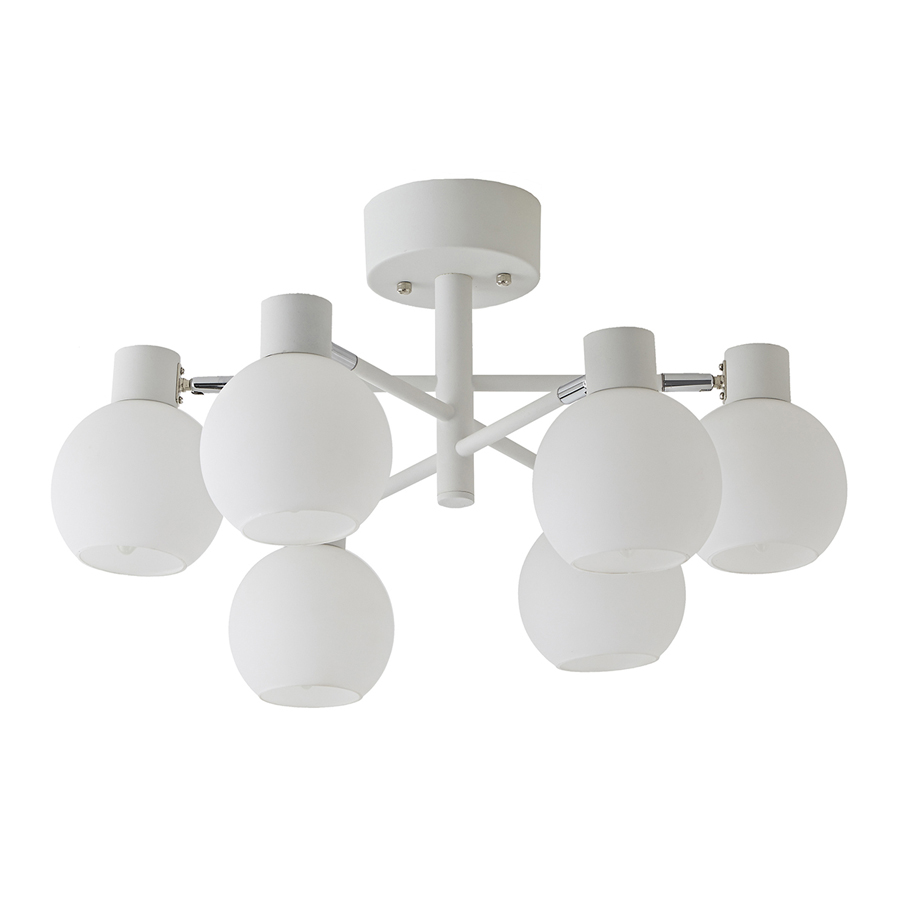 The TROMSSA ceiling lamp is a beautiful combination of metal and white glass. Thanks to the large glass surface (12cm), it emits a pleasant but glare-free light. The six glasses can be directed in different directions according to your preference. The lamp can be hung with a hook and has a light plug inside.